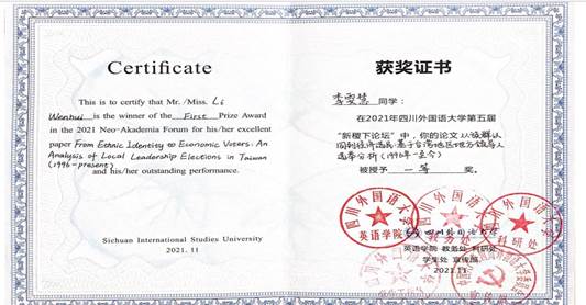 最终,新葡的京集团350vip8888同学共获得1个一等奖(总共3个一等奖),2个二等奖(总共6个二等奖),2个三等奖和3个优秀奖。其中由李雯慧、全薏霖、潘若浅三位同学合写的论文《从族群认同到经济选民:基于台湾地区地方领导人选举分析(1996年-至今)》获得一等奖,全薏霖同学撰写的论文《新功能主义“外溢”理论失灵在拉美一体化进程缓慢中的展现及对策》和熊振同学撰写的论文《2021巴以冲突后以色列对阿外交的新动向》获得二等奖,敬明柯同学撰写的论文《土耳其媒体所呈现的中国国家形象研究——以阿纳多卢通讯社报道 (2020-2021)为例》和角红媛同学撰写的论文《中日双边关系——基于“事件数据分析法”的视角》获得了三等奖,蒋欣洛同学撰写的论文《“乌曼朝圣”事件及其对乌克兰-以色列两国关系的影响研究》、吕佳育同学撰写的论文《“美国圈子”背后的“大战略”》和严烨同学撰写的论文《探析中国石油外交互动因素——基于美国撤军阿富汗事件》获得了优秀奖。