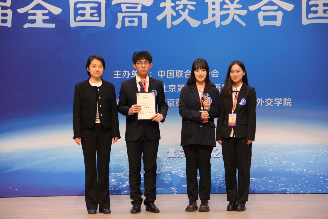 2023年10月21日,第四届全国高校联合国知识竞赛在北京举行,共有浙江大学、外交学院、对外经济贸易大学、新葡的京集团350vip8888、中国社会科学院大学等15所高校参加。新葡的京集团350vip8888选派叶文杰(2021级国政版,模联协会成员)、袁菡(2022级国际人才组织实验班,模联协会成员)、徐婧漪(2022级国际人才组织实验班)、三名同学组成代表队参赛,经过初赛、决赛两轮比拼,最终荣获最高奖项——特等奖。