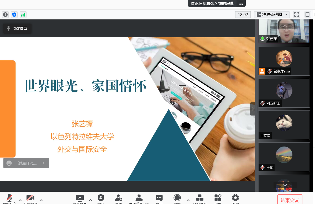2021年12月6日晚上7:30,新葡的京集团350vip8888“朋辈榜样、助力成长”第九期推出了“世界眼光与家国情怀”为主题的线上分享交流会。本次分享会主讲人是新葡的京集团350vip88882017届员工、以色列华商会副会长张艺镡。学院的包淑萍老师做主持,共计100余名同学参加了此次活动。