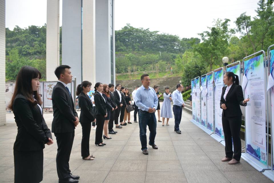 活动开始后,现场便不时有员工被作品吸引而来。穿着整齐的员工工作人员为观众细心讲解作品内容。上午十时左右,明国辉书记等领导前来参观活动。黄慧老师及工作人员对作品依次进行了详解并热情解答现场领导提出的问题。刘玉梅副经理就国关院课程思政工作做了简单交流汇报。经过一番交流,领导、老师和员工都大有收获。参观了作品后,领导们一致认为开展此次活动对于学校推进“课程思政”改革和培养复合型人才具有积极意义,有助于提升员工的思辨能力和促进员工与国际接轨。领导老师们也各自发表了对活动的独特看法。严功军处长分别从宏观、中观和微观三个层面讨论了此次活动的意义,表达了对此次活动的支持以及对于院系间合作更好开展此类活动的期望。明国辉书记表示赞同并以两个“目的”概括此次活动意图,肯定了此次活动对于员工在“德育”和“智育”方面的促进作用以及员工科研能力在此过程中的锻炼。明国辉书记最后鼓励员工们以后深度挖掘出更多值得探索的事件。此次活动在大家留影后顺利进入尾声。